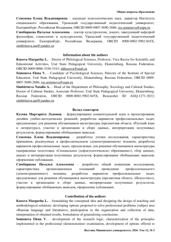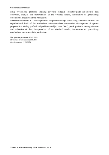 Обсуждение и заключения. Оптимальной формой проведения демонстрационного экзамена педагогов определена соответствующая его задачам технология деятельностного типа, основанная на активном способе взаимодействия участников, – деловая игра. В ходе деловой игры экзаменуемые магистранты моделируют ситуацию заседания методического объединения или педагогического совета, где реализуют решение профессиональной задачи. Содержательные аспекты профессионального (демонстрационного) экзамена раскрываются в статье на материале конкретных иллюстраций вариантов экзаменационных заданий для обучающихся магистратуры по направлениям подготовки «Педагогическое образование» (на примере предметных областей «Русский язык и литература» и «Искусство») и «Специальное (дефектологическое) образование».