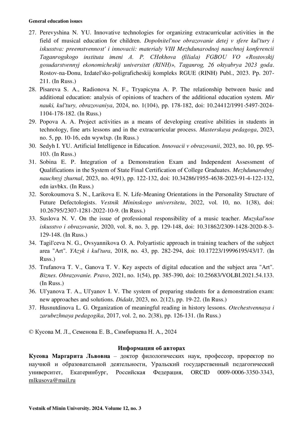 33. Суслова Н. В. К вопросу о профессиональной ответственности педагога-музыканта // Музыкальное искусство и образование. 2020. Т. 8, № 3. С. 129-148. https://doi.org/10.31862/2309-1428-2020-8-3-129-148.