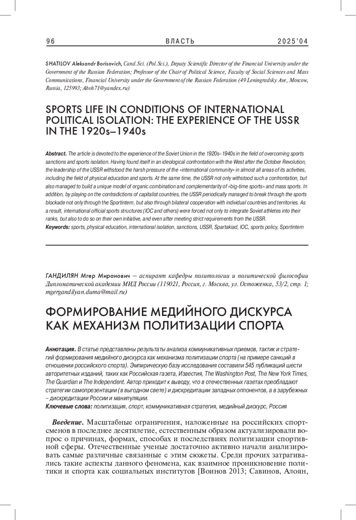 В статье представлены результаты анализа коммуникативных приемов, тактик и стратегий формирования медийного дискурса как механизма политизации спорта (на примере санкций в отношении российского спорта). Эмпирическую базу исследования составили 545 публикаций шести авторитетных изданий, таких как Российская газета, Известия, The Washington Post, The New York Times, The Guardian и The Independent. Автор приходит к выводу, что в отечественных газетах преобладают стратегии самопрезентации (в выгодном свете) и дискредитации западных оппонентов, а в зарубежных - дискредитации России и манипуляции.