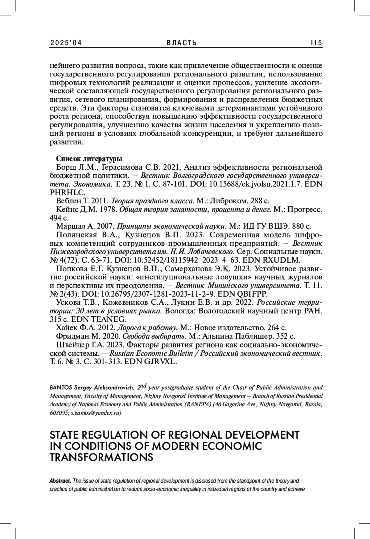 1. Борщ Л.М., Герасимова С.В. 2021. Анализ эффективности региональной бюджетной политики. - Вестник Волгоградского государственного университета. Экономика. Т. 23. № 1. С. 87-101. DOI: 10.15688/ek.jvolsu.2021.1.7 EDN: PHRHLC