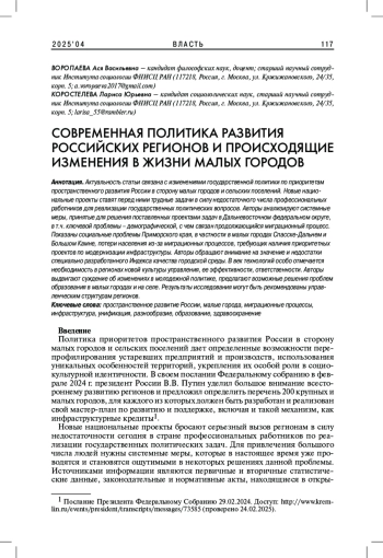 Актуальность статьи связана с изменениями государственной политики по приоритетам пространственного развития России в сторону малых городов и сельских поселений. Новые национальные проекты ставят перед ними трудные задачи в силу недостаточного числа профессиональных работников по реализации государственных политических вопросов. Авторы анализируют системные меры, принятые для решения поставленных проектами задач в Дальневосточном федеральном округе, в т. ч. ключевой проблемы - демографической, с чем связан продолжающийся миграционный процесс. Показаны социальные проблемы Приморского края, в частности в малых городах Спасск-Дальний и Большой Камень, потери населения из-за миграционных процессов, требующих наличия приоритетных проектов по модернизации инфраструктуры. Авторы обращают внимание на значение и недостатки специально разработанного Индекса качества городской среды. В век технологий особо отмечается необходимость в регионах новой культуры управления, его эффективность, ответственность. Авторы выдвигают суждение об изменениях в молодежной политике, предлагают возможные решения проблем образования в малых городах и на селе. Результаты исследования могут быть рекомендованы управленческим структурам регионов.