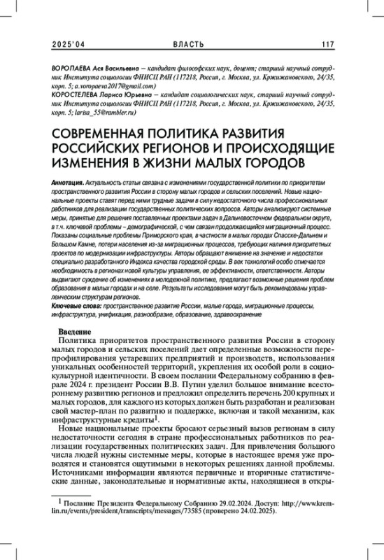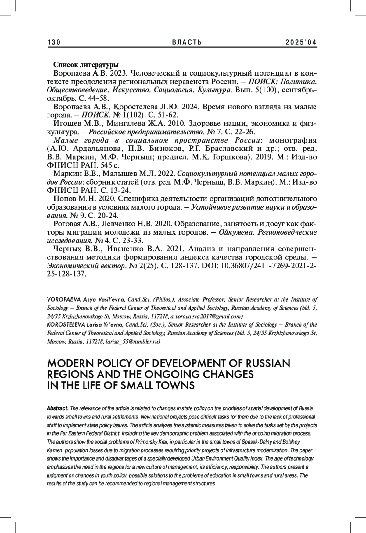 2. Воропаева А.В., Коростелева Л.Ю. 2024. Время нового взгляда на малые города. - ПОИСК. № 1(102). С. 51-62.