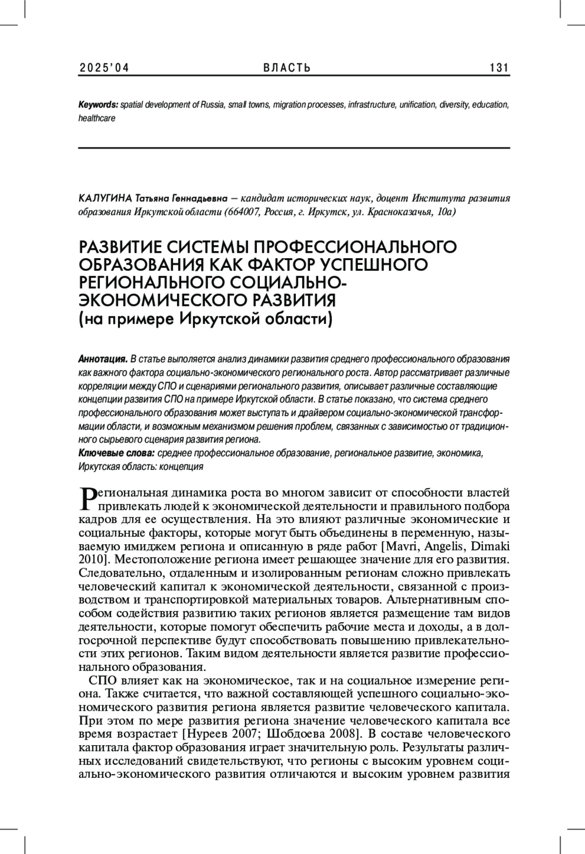 В статье выполняется анализ динамики развития среднего профессионального образования как важного фактора социально-экономического регионального роста. Автор рассматривает различные корреляции между СПО и сценариями регионального развития, описывает различные составляющие концепции развития СПО на примере Иркутской области. В статье показано, что система среднего профессионального образования может выступать и драйвером социально-экономической трансформации области, и возможным механизмом решения проблем, связанных с зависимостью от традиционного сырьевого сценария развития региона.