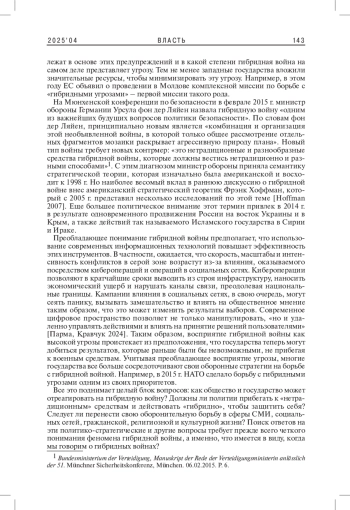 Статья посвящена пониманию природы гибридной войны, собирательный термин которой описывает ее как агрессию, находящуюся в серой зоне между войной и миром, сочетание военных и невоенных способов ведения войны с целью достижения определенных политических, экономических или иных целей. Автор утверждает, что избежать или преодолеть нормативные и стратегические дилеммы, которые несет с собой «война без границ», вряд ли возможно без пересмотра исторически сложившегося понимания войны. Поэтому фокус исследования смещается на рассмотрение традиционного понимания войны как симметричного и регулируемого на международном уровне противостояния двух противников, а также сложной взаимосвязи между историческим военным опытом и вытекающими из него идеями войны. Подводя итоги, автор отмечает, что гибридная сущность войны не поддается четкому концептуальному определению, но, тем не менее, может быть понята в своих разнородных элементах и характеристиках, являясь полезным средством для размышлений о прошлом, настоящем и будущем войны.