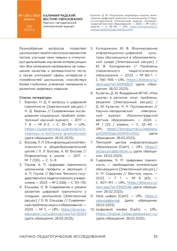3. Глухов, А. П. Цифровая грамотность школьников: профили и эволюция / А. П. Глухов // Вестник Томского государственного педагогического университета. - 2023. - № 2 (226). - С. 101-110.