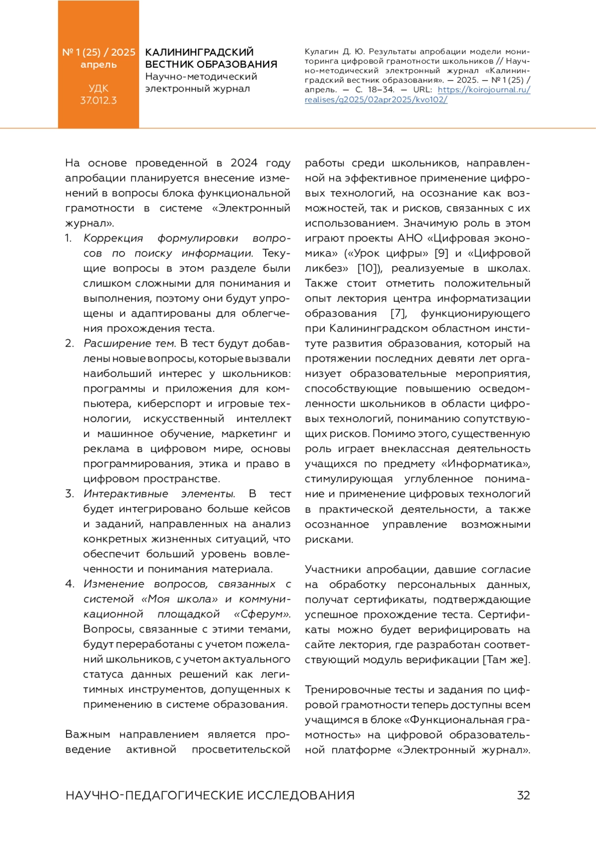 6. Кулагин, Д. Ю. Внедрение ФГИС “Моя школа” в регионе: опыт, проблемы, решения [Электронный ресурс] / Д. Ю. Кулагин, Н. Н. Пустоваченко // Научно-методический электронный журнал “Калининградский вестник образования”. - 2024. - № 1 (21) / апрель. - С. 22-43. - URL: https://koirojournal.ru/realises/g2024/05apr2024/kvo102/ (дата обращения: 26.02.2025).