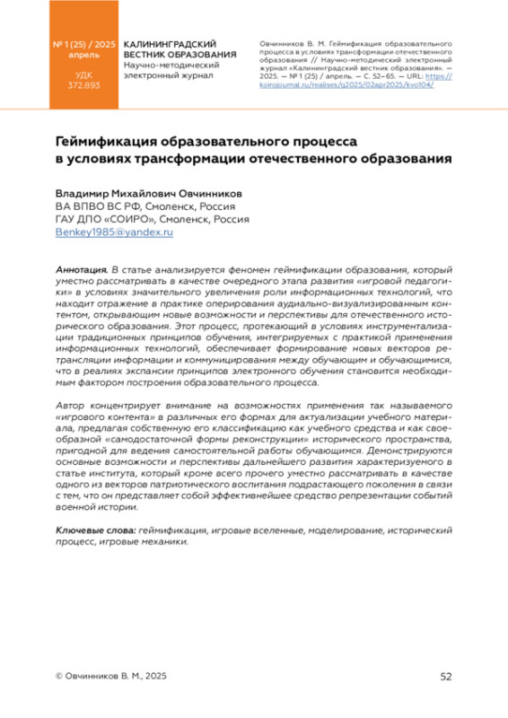 В статье анализируется феномен геймификации образования, который уместно рассматривать в качестве очередного этапа развития «игровой педагогики» в условиях значительного увеличения роли информационных технологий, что находит отражение в практике оперирования аудиально-визуализированным контентом, открывающим новые возможности и перспективы для отечественного исторического образования. Этот процесс, протекающий в условиях инструментализации традиционных принципов обучения, интегрируемых с практикой применения информационных технологий, обеспечивает формирование новых векторов ретрансляции информации и коммуницирования между обучающим и обучающимися, что в реалиях экспансии принципов электронного обучения становится необходимым фактором построения образовательного процесса.