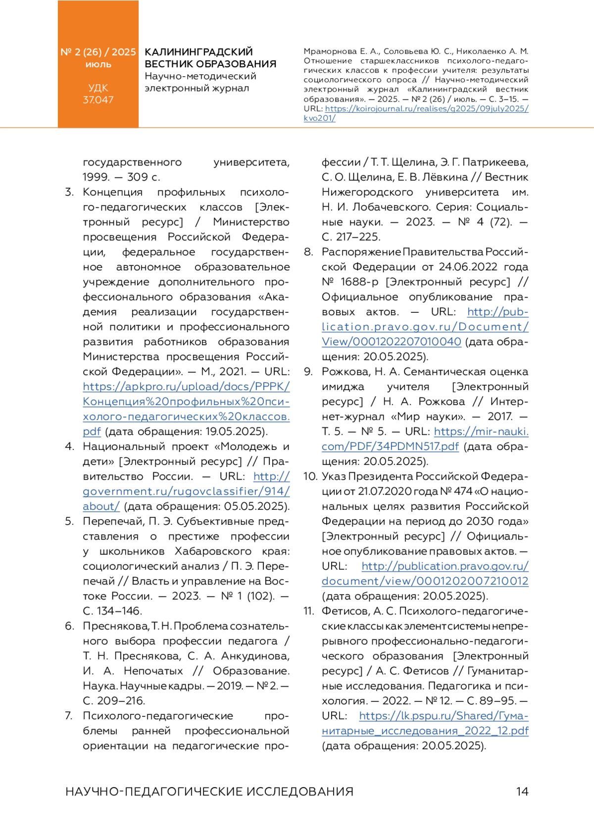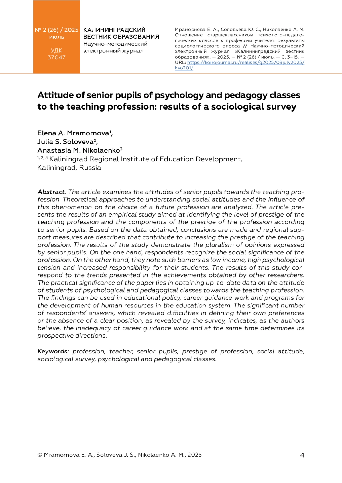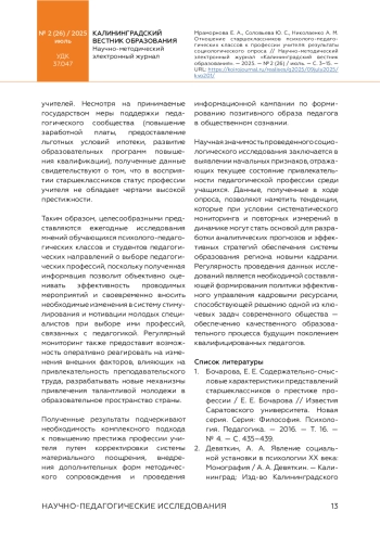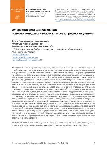 МРАМОРНОВА Е. А., СОЛОВЬЕВА Ю. С., НИКОЛАЕНКО А. М. ОТНОШЕНИЕ СТАРШЕКЛАССНИКОВ ПСИХОЛОГО-ПЕДАГОГИЧЕСКИХ КЛАССОВ К ПРОФЕССИИ УЧИТЕЛЯ // КАЛИНИНГРАДСКИЙ ВЕСТНИК ОБРАЗОВАНИЯ. 2025. № 2 (26)