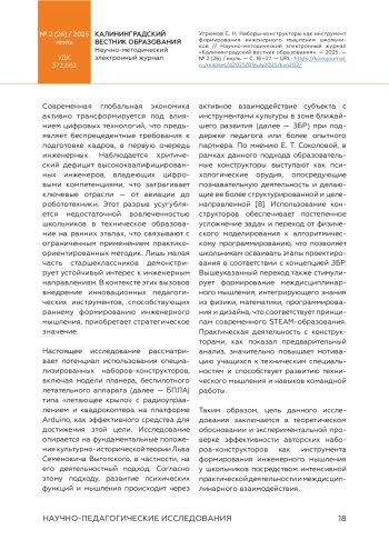 В статье рассмотрено, как наборы-конструкторы могут помочь школьникам 7-х — 11-х классов развить инженерное мышление в контексте цифровой экономики и дефицита кадров. Цель работы — теоретически обосновать и экспериментально проверить эффективность применения специализированных наборов-конструкторов как инструмента формирования инженерного мышления у школьников 7-х — 11-х классов. Исследование базируется на деятельностном подходе Л. С. Выготского и принципах междисциплинарного STEAM-образования. В рамках исследования были разработаны три авторских набора-конструктора (планер, беспилотный летательный аппарат типа «летающее крыло» с радиоуправлением и квадрокоптер на платформе Arduino); проведен эксперимент с участием 300 школьников из Калининграда, Казани, Новосибирска. Исследование включало диагностику технического мышления, опросы участников и педагогов. Результаты эксперимента показали значительное повышение мотивации школьников к инженерным профессиям (82 %), существенное развитие технических навыков (рост среднего балла технического мышления на 37 %) и навыков командной работы (улучшение на 45 %). Работа с конструкторами позволяет эффективно интегрировать знания из физики, математики, информатики и дизайна. Предложена модель внедрения, авторских образовательных наборов-конструкторов, учитывающая возрастные особенности и преемственность обучения. Подчеркивается, что практическое проектирование готовит к требованиям цифровой экономики, однако требует методической поддержки педагогов, особенно в области цифровых технологий.