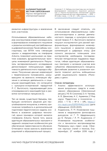 Благодарности: выражаю глубокую признательность Лилии Алексеевне Зорькиной, ректору Калининградского областного института развития образования, за организационную поддержку и создание условий для реализации исследовательского проекта. Особая благодарность Валерии Павловне Вейдт, проректору по научно-методической работе института, за профессиональное сопровождение, ценные рекомендации по структурированию данных и помощь в подготовке методических материалов. Их экспертиза и вовлеченность в развитие инженерного образования стали ключевыми факторами успешного выполнения работы.