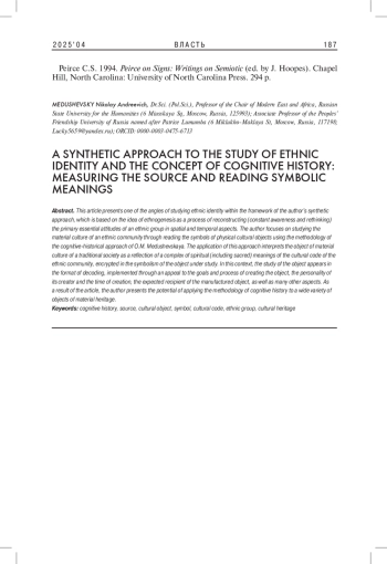 Статья представляет один из ракурсов изучения этнической идентичности в рамках авторского синтетического подхода, в основе которого заложено представление об этногенезе как о процессе реконструирования (постоянного осознания и переосмысления) первичных эссенциальных установок этнической группы в пространственном и темпоральном аспектах. Автор делает акцент на изучении материальной культуры этнического сообщества через прочтение символов физических объектов культуры с помощью применения методологии когнитивно-исторического подхода О. М. Медушевской. Применение данного подхода трактует объект материальной культуры традиционного общества как отражение комплекса духовных (в т. ч. сакральных) смыслов культурного кода этнического сообщества, зашифрованных в символизме изучаемого объекта. В данном контексте изучение объекта предстает в формате дешифровки, реализуемой через обращение к целям и процессу создания объекта, личности его создателя и времени создания, ожидаемому реципиенту изготовленного объекта, а также многим иным аспектам. По итогам статьи автор представляет потенциал применения методологии когнитивной истории к широкому разнообразию объектов материального наследия.