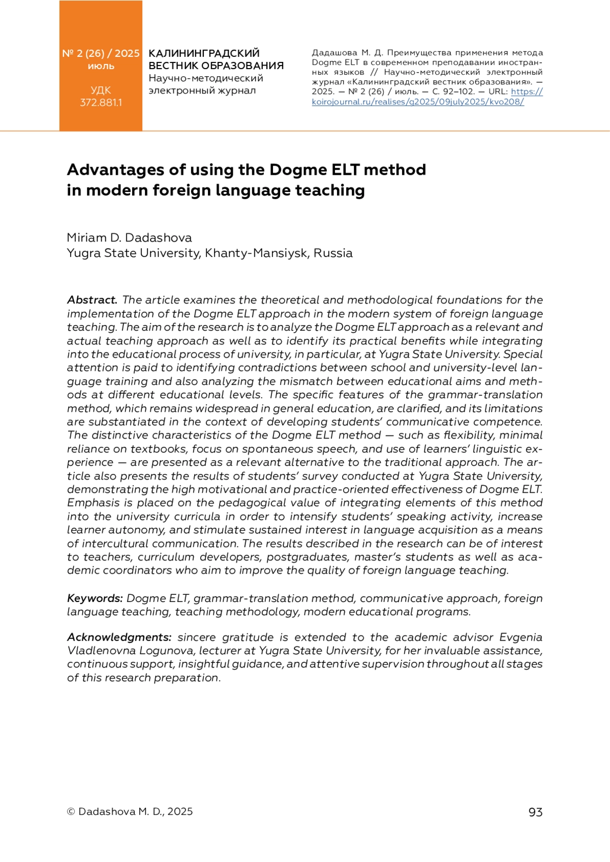 В статье рассматриваются теоретико-методологические основания внедрения метода Dogme ELT в современную систему преподавания иностранного языка. Целью исследования является рассмотрение метода Dogme ELT как современного и актуального подхода к обучению, а также выявление его практических преимуществ при интеграции в учебный процесс вуза, в частности, в Югорском государственном университете. Особое внимание уделяется выявлению противоречий между школьной и вузовской языковой подготовкой, а также анализу несоответствия целей и методик преподавания на разных уровнях образования. Уточняется специфика грамматико-переводного метода, широко распространенного в системе общего образования, и обосновываются его ограничения в контексте формирования коммуникативной компетенции у студентов. Выявляются характерные признаки метода Dogme ELT, такие как гибкость, минимизация учебных материалов, ориентация на спонтанную речь и опора на речевой опыт обучающихся в качестве актуальной альтернативы традиционному подходу. Представлены результаты опроса студентов Югорского государственного университета, свидетельствующие о высокой мотивационной и практико-ориентированной эффективности Dogme ELT. В статье делается акцент на целесообразности включения элементов данного метода в образовательную программу вуза для интенсификации речевой активности, повышения учебной автономии студентов и формирования устойчивой заинтересованности в изучении иностранного языка как средства межкультурной коммуникации. Результаты, описанные в исследовании, могут представлять интерес для преподавателей, методистов, аспирантов, магистрантов, а также для руководителей образовательных программ, стремящихся повысить качество преподавания иностранных языков.