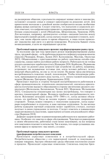В статье изучается влияние на семейную жизнь характерного для современного общества повсеместного использования цифровых технологий и, в первую очередь, социальных медиа. Исследуются факторы, связанные с частотой и целями использования социальных сетей, и их воздействие на ключевые характеристики семейной жизни. В частности, рассматривается, как активность в социальных медиа сказывается на уровне удовлетворенности семейной жизнью, частоте возникновения конфликтов, качестве коммуникации между партнерами и степени доверия между ними. Респондентами выступили представители различных возрастных групп, а также семьи с разным количеством детей. Такой подход позволил выявить ключевые закономерности и сформулировать практические рекомендации для укрепления семейных связей в условиях растущей цифровизации общества. Основной вывод исследования заключается в необходимости нахождения баланса между виртуальной и реальной жизнью для поддержания гармоничных отношений внутри семьи. В то же время разумное и целенаправленное использование социальных медиа может способствовать укреплению семьи, если оно не подменяет собой живое общение.