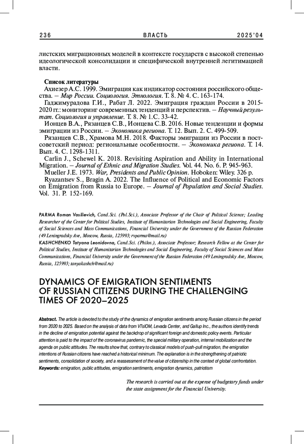 Статья посвящена исследованию динамики эмиграционных настроений среди российских граждан в период с 2020 по 2025 г. На основе анализа данных ВЦИОМа, Левада-Центра, Института Гэллапа авторы выявляют тенденции снижения эмиграционного потенциала на фоне значимых внешнеполитических и внутренних событий. Особое внимание уделяется влиянию факторов пандемии коронавируса, проведения специальной военной операции, внутренней мобилизации и повестки дня на общественные установки. Результаты показывают, что, вопреки классическим моделям push-pull миграции, эмиграционные намерения граждан России достигли исторического минимума. Объяснение видится в усилении патриотических настроений, консолидации общества и переоценке ценности гражданства в условиях мировой конфронтации.