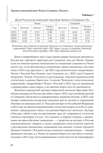 Согласно национальной статистике Чехии и Словакии доля России в товарообороте этих стран с 2021 года по 2024 год уменьшилась для Чехии более чем в 2 раза (с 2,99% до 1,03%), а для Словакии — в 1,8 раза (с 3,94% до 2,16%), таблица 1. Рост этого показателя в 2022 году связан с ростом доли России в импорте обеих стран (для Чехии с 3,91% до 5,76%, для Словакии с 6,42% до 7,62%), что связано с повышением цен на энергоресурсы.