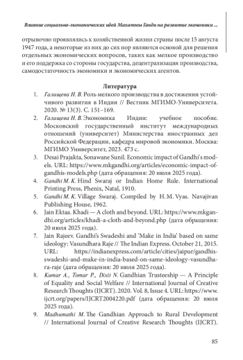 1. Галищева Н. В. Роль мелкого производства в достижении устойчивого развития в Индии // Вестник МГИМО-Университета. 2020. № 13(3). С. 151-169.