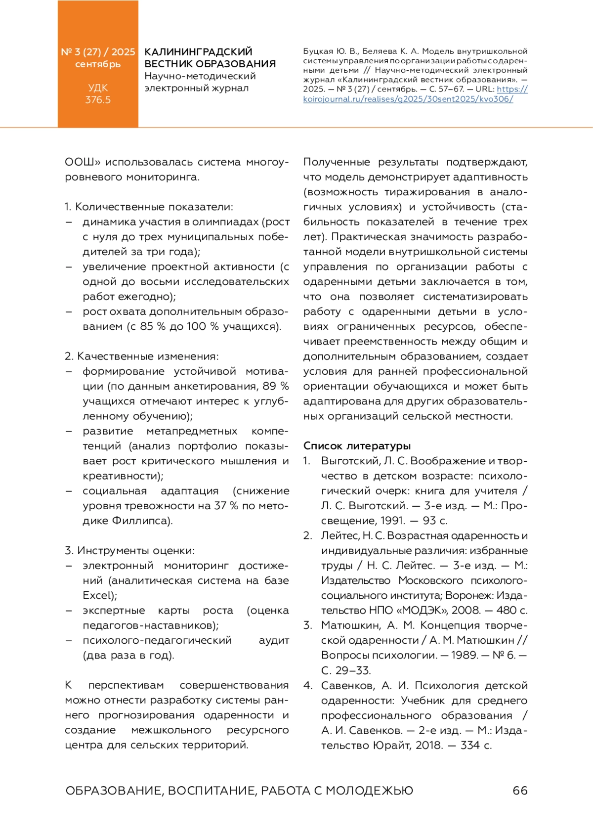 Практическая значимость модели заключается в ее адаптивности для малокомплектных сельских школ и возможности тиражирования. Перспективы развития включают создание межшкольного ресурсного центра и систему раннего прогнозирования одаренности. Представленный управленческий опыт показал достаточную эффективность и может быть использован образовательными учреждениями сельской местности для повышения качества работы с талантливыми обучающимися.