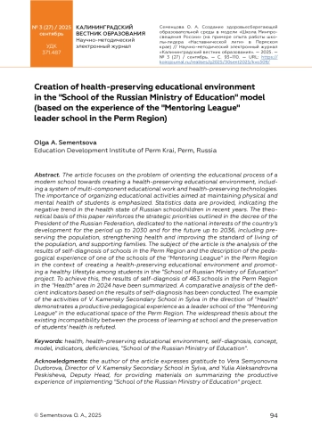 В статье акцентируется внимание на проблеме ориентации образовательного процесса современной школы на создание здоровьесберегающей образовательной среды с включением системы многокомпонентной воспитательной работы и здоровьесберегающих технологий. Подчеркивается значимость организации воспитательной деятельности, направленной на поддержание физического и психического здоровья обучающихся. Приводятся статистические данные, свидетельствующие о негативной динамике состояния здоровья российских школьников за последние годы. Теоретическая база публикации подкрепляется стратегическими приоритетами, обозначенными в указе Президента Российской Федерации, посвященном национальным целям развития страны на период до 2030 года и на перспективу до 2036 года, в том числе сохранении населения, укреплении здоровья и повышения благополучия людей, поддержке семей. Предметом исследования в статье является анализ результатов самодиагностики школ Пермского края и описание педагогического опыта работы одной из школ «Наставнической лиги» Пермского края в контексте создания здоровьесберегающей образовательной среды и формирования здорового образа жизни у обучающихся в модели проекта «Школа Минпросвещения России». Для этого обобщены результаты самодиагностики 463 школ Пермского края по магистральному направлению «Здоровье» в 2024 году. Приведен сравнительный анализ дефицитарных показателей по результатам самодиагностики. На примере деятельности МАОУ «Сылвенская средняя школа имени В. Каменского» по направлению «Здоровье» демонстрируется продуктивный педагогический опыт в качестве школы-лидера «Наставнической лиги» в образовательном пространстве Пермского края. Опровергается распространенный тезис о несовместимости процесса обучения в школе и сохранения здоровья обучающихся.