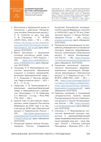 14. Цибульникова, В. Е. Здоровьеформирующая и здоровьесберегающая среда как компонент образовательной среды школы / В. Е. Цибульникова // Наука и школа. - 2018. - № 1. - С. 156-165.