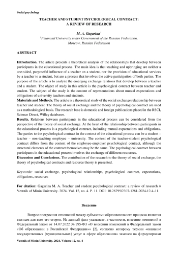 Материалы и методы. Статья представляет собой теоретическое исследование отношений социального обмена между преподавателем и студентом. В качестве методологической основы используются теория социального обмена и теория психологического контракта. База исследования – отечественные и зарубежные публикации, размещенные в базах данных РИНЦ, Science Direct, Willey.