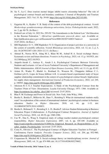 1. Гагарина М. А., Рябов В. Б. Исследование содержания долгового психологического контракта // Вестник Московского государственного областного университета. Серия: Психологические науки. 2022. № 2. С. 60-78.