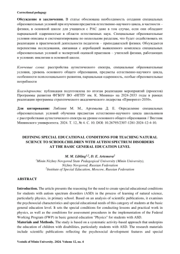 Обсуждение и заключения. В статье обоснована необходимость создания специальных образовательных условий при изучении предметов естественно-научного цикла, в частности – физики, в основной школе для учащихся с РАС даже в том случае, если они обладают парциальной одаренностью в области естественных наук. Специальные образовательные условия описаны и систематизированы по нескольким разделам, что будет содействовать их реализации в практической деятельности педагогов – преподавателей физики. Обсуждается перспектива исследования, связанная с апробацией выявленного комплекса специальных образовательных условий и экспертной оценкой практиков – учителей физики, работающих в условиях инклюзии в основной школе.