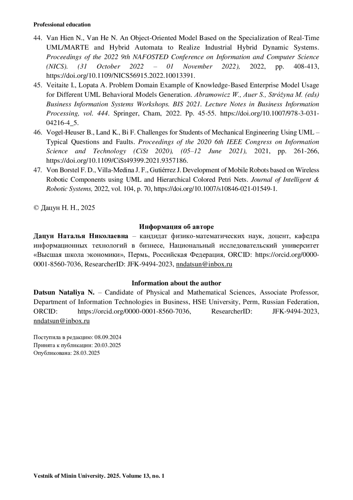 46. Vogel-Heuser B., Land K., Bi F. Challenges for Students of Mechanical Engineering Using UML - Typical Questions and Faults // Proceedings of the 2020 6th IEEE Congress on Information Science and Technology (CiSt 2020), (05-12 June 2021). 2021. Pp. 261-266. https://doi.org/10.1109/CiSt49399.2021.9357186.