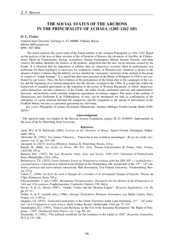 Статья посвящена изучению вопроса о социальном положении ромейской знати в Ахейском княжестве в 1204-1262 гг. На основании анализа текстов трех версий «Морейской хроники», свидетельств Жоффруа де Виллардуэна, Анри де Валансьена, Георгия Акрополита, Георгия Пахимера, Марино Санудо Торчелло и иных источников автор выявляет особенности процесса интеграции архонтов в новую общественную структуру, созданную франками. Делается вывод о том, что наложение военной обязанности на ἄρχοντες происходило в том случае, если ее исполнение было для них традиционным (милинги) или необходимым завоевателям (монемвасиоты). Обращается внимание на отсутствие прямых подтверждений тому, что служба влекла за собой «автоматическое» включение архонтов в группу вассалов «простого оммажа». Констатируется, что первые свидетельства участия представителей греческой элиты в походах латинян и начала ограниченной интеграции знатных ромеев в рыцарское сословие приходятся на 1260-е гг., а их массовое участие в битве при Пелагонии 1259 г. не подтверждается ни одним источником. Отмечается, что в рамках стандартных договоренностей о переходе под власть западных европейцев, в которых ἄρχοντες именовали себя слугами (δοῦλοι) франков, благородные греки исполняли консультативные и административные функции, а также, вероятно, могли оказывать князю временную военную поддержку. Соглашение монемвасиотов и Гийома II де Виллардуэна, в свою очередь, можно трактовать не только как подтверждение возникновения вассально-ленных отношений между завоевателями и завоеванными или распространения наемничества во франкской Морее, но и как заключение фьеф-рентного договора.