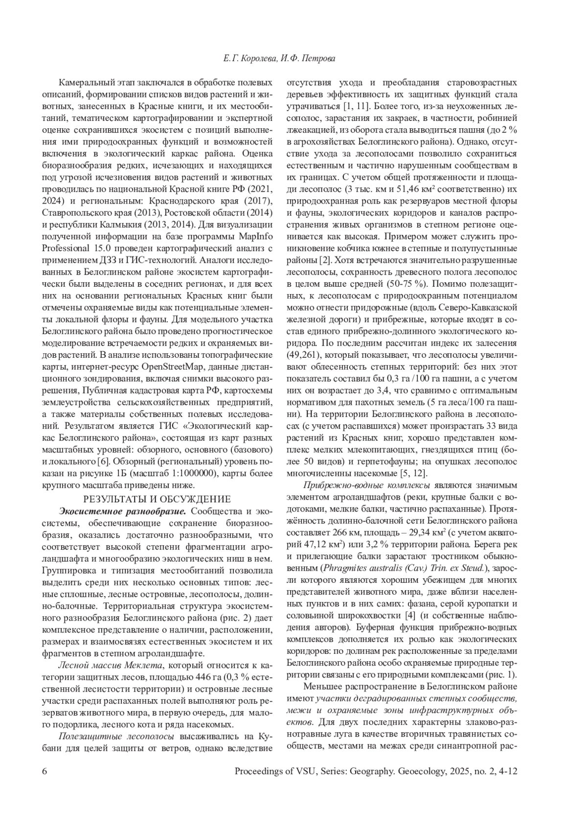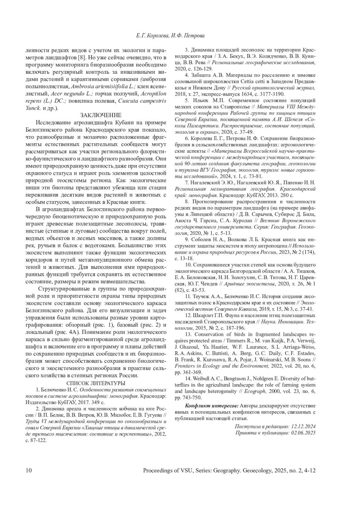 6. Королева Е. Г., Петрова И. Ф. Сохранение биоразнообразия в сельскохозяйственных ландшафтах: агроэкологические аспекты // “Материалы Всероссийской научно-практической конференции с международным участием, посвященной 90-летию создания факультета географии, геоэкологии и туризма ВГУ География, экология, туризм: новые горизонты исследований”, 2024, т. 1, с. 73-81. EDN: MRTADK
