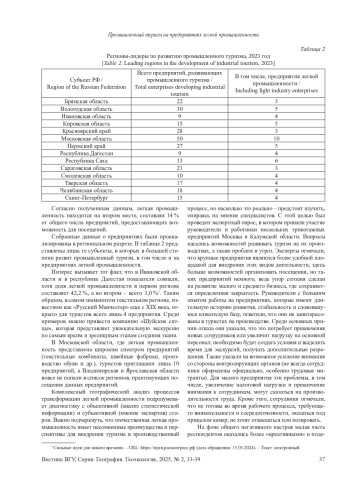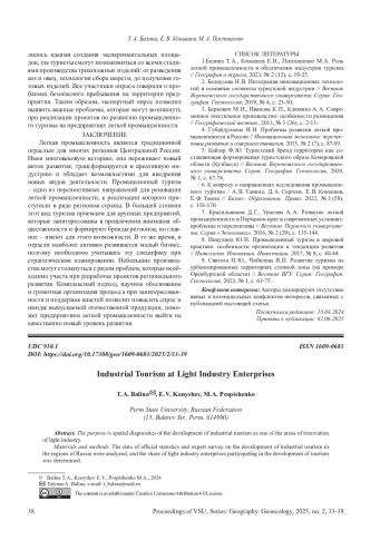 1. Балина Т.А., Конышев Е. В., Поспишенко М.А. Роль легкой промышленности в обеспечении индустрии туризма // География и туризм, 2023, № 2 (12), с. 19-25. EDN: MVAKGE
