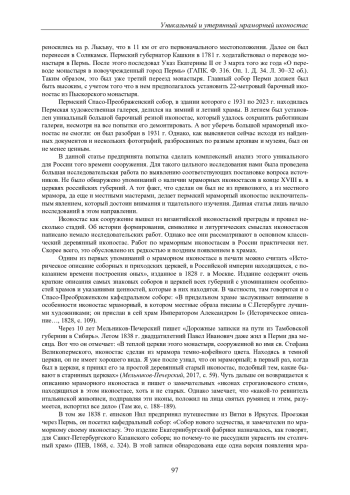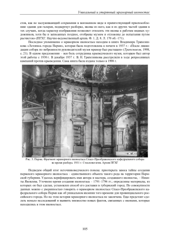 Пермский Спасо-Преображенский кафедральный собор имеет более чем 200-летнюю историю. Он часто и много перестраивался, расширялся, добавлялись приделы. Изначально собор делился на два храма: летний и зимний. В летнем был установлен сохранившийся до наших дней барочный деревянный иконостас, привезенный из Пыскорского ставропигиального монастыря; второй иконостас в зимнем, Стефановском, храме был выполнен из мрамора. Он был разобран после передачи здания собора в 1931 г. для нужд Пермской художественной галереи. По проекту архитектора Н. А. Шварёва была сделана внутренняя реконструкция, необходимая для размещения художественного музея. О том, что представлял собой мраморный иконостас, писали очень кратко в дореволюционных изданиях. Упоминалось, что он был сделан по заказу вице-губернатора И. М. Борноволокова на Горнощитском мраморном заводе. Говорилось также о размещенных в нем иконах кисти художников Императорской академии художеств, дарованных А. С. Строгановым. Однако знаний в деталях о том, кто был автором, мастером иконостаса, из каких точно видов мрамора и в какие сроки он был сделан, как доставлен в Пермь, на данный момент не сохранилось. В публикуемой статье предпринимается попытка реконструировать историю создания мраморного иконостаса, обосновать авторство его создателя, дать общую характеристику объекта и доказать его уникальность. Большинство документов, использованных в публикации, в том числе и фотографии, вводятся в научный оборот впервые.