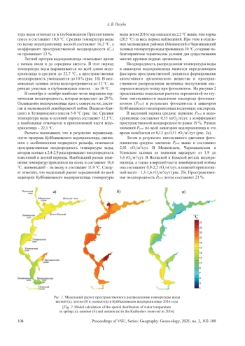 Цель - оценка пространственно-временных закономерностей распределения полей температуры воды и концентрации растворенного в воде кислорода в акватории Куйбышевского водохранилища в условиях жаркого года с использованием математической модели. Материалы и методы. Разработана численная 2D пространственно-неоднородная модель динамики полей температуры воды, первичной продукции и содержания растворенного в воде кислорода. Модель описывает формирование кислородного режима с учетом неустановившегося режима течений и неравномерного прогрева акватории водохранилища с пространственным шагом 200 метров и суточным шагом по времени. Результаты и обсуждение. На основе численных экспериментов исследована конвекция поля температуры, динамика растворенного в воде кислорода и первичной продукции в Куйбышевском водохранилище в безледный период. Выявлены разномасштабные зоны акватории с различным прогревом водной толщи и содержанием кислорода. Показано, что осенью пространственная неоднородность температуры воды примерно в три раза выше, чем в весенний и летний периоды. Отмечается большой вклад (> 50 %) фотосинтеза фитопланктона в общий баланс кислорода в период цветения. Выводы. Получены карты пространственного распределения температуры воды, содержания растворенного кислорода и первичной продукции в самый жаркий за последние 10 лет 2016 год. Сопоставление расчетных и натурных значений показателей оценивалось критерием Тейла, который показал удовлетворительную их сходимость. Это позволяет использовать разработанную модель для дальнейших исследований современного состояния Куйбышевского водохранилища.