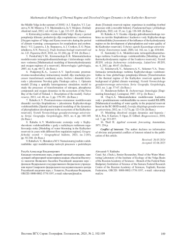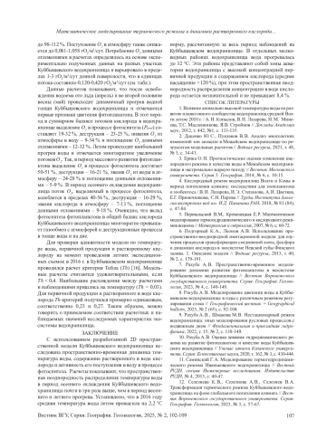 2. Даценко Ю. С., Пуклаков В. В. Анализ многолетних изменений зон аноксии в Можайском водохранилище по результатам модельных расчетов // Водные ресурсы, 2021, т. 48, № 1, с. 34-41. EDN: WGJTZD