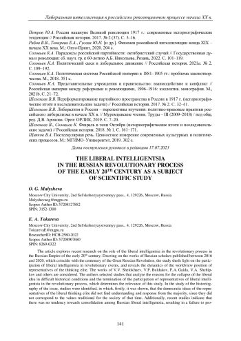 Приведены результаты исследования вопроса о роли либеральной интеллигенции в революционном процессе в Российской империи начала XX в. Материалом для исследования стали работы отечественных ученых 2016-2020 гг., вышедшие к столетию Великой российской революции. Их анализ позволяет оценить наметившиеся в профессиональных исследованиях подходы к осмыслению реальной картины исторических событий того времени, раскрытию степени участия либеральной интеллигенции в революционных событиях, выявлению динамики мировоззренческой позиции представителей мыслящей элиты. Авторами рассматривались работы таких известных в этой области ученых, как В. В. Шелохаев, В. П. Булдаков, К. А. Соловьев, Ф. А. Гайда, В. А. Щипков и др. В исследованиях так или иначе анализируются причины краха либеральной идеи в сложных исторических условиях и прекращения участия в революционном процессе представителей либеральной интеллигенции. Анализ современной историографической ситуации проблемы показывает, что демократические идеи представителей либерально мыслящей элиты не могли найти понимания, отклика у большинства населения страны, так как они в целом не соответствовали традиционным для общества того времени ценностям. Кроме того, в научных работах последнего времени уточняется: в среде либеральной интеллигенции отсутствовала тенденция к консолидации; понятные для большинства, конкретные ответы на вызовы времени не были представлены. В результате либеральная интеллигенция постепенно становилась сторонним участником революционного процесса.