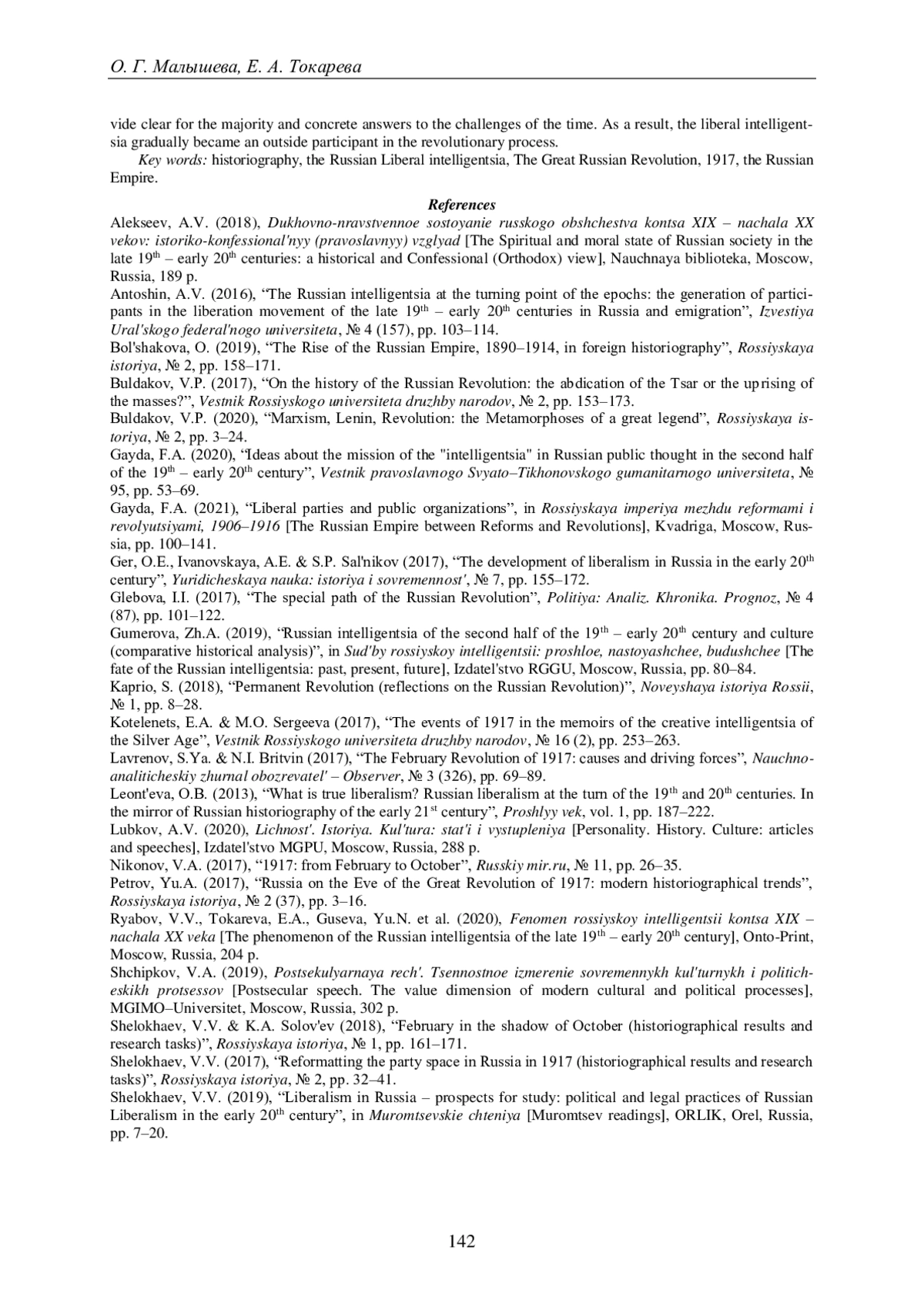 21. Рябов В.В., Токарева Е.А., Гусева Ю.Н. [и др.]. Феномен российской интеллигенции конца XIX - начала XX века. М.: Онто-Принт, 2020. 204 с. EDN: NPZCWP
