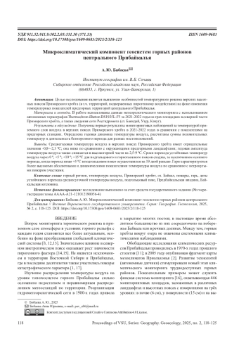 Целью исследования является выявление особенностей температурного режима верхних высотных поясов Приморского хребта (в т. ч. территорий, подверженных пирогенному воздействию) на фоне изменения температурных показателей предгорных территорий центрального Прибайкалья. Материалы и методы. В работе использованы данные метеорологического мониторинга с использованием автономных термографов Thermochron iButton DS1925L-F5 за 2021-2022 годы на трех площадках в северной части Приморского хребта, а также сведения сети Росгидромета (ст. Баяндай, Узур, Качуг). Результаты и обсуждение. Получены первые результаты мониторинговых наблюдений за температурой приземного слоя воздуха в верхних поясах Приморского хребта в 2021-2022 годах в сравнении с показателями на предгорных станциях. Определена годовая динамика температуры воздуха, рассчитаны суммы положительных температур и длительность безморозного периода для разных местоположений. Выводы. Среднегодовая температура воздуха в верхних поясах Приморского хребта имеет отрицательные значения -0,8-2,3 °С; она ниже по сравнению с окружающими предгорными ландшафтами; годовая амплитуда температуры воздуха также снижается в высокогорной части на 2,5-9 °С. Сроки перехода устойчивых температур воздуха через 0 °, +5 °; +10 °; +15 °С для подгольцового и горнотаежного поясов сходны, за исключением осеннего периода, когда переход ниже +5 °С в подгольцовом поясе осуществлялся на 19 дней раньше. Г ари характеризуются более высокими абсолютными и динамическими показателями температуры воздуха по сравнению с нетронутыми пожаром участками.