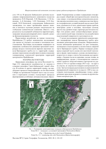 Температурные условия горных территорий, обрамляющих оз. Байкал – объект всемирного природного наследия ЮНЕСКО, в настоящее время остаются наименее изученными. Вместе с тем именно они множественными потоками, процессами и явлениями тесно связаны с экосистемой озера и являются неким «буфером», обеспечивающим его сохранность для мирового сообщества. Организованные мониторинговые исследования температурного режима воздуха геосистем Приморского хребта имеют чрезвычайно важное значение для понимания функционирования геосистем региона, оценке их современного состояния, направленности и потенциала их восстановительной динамики.