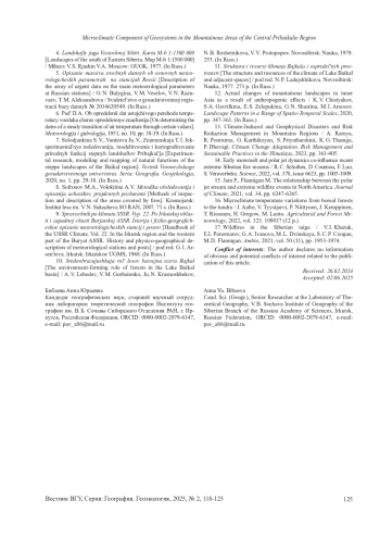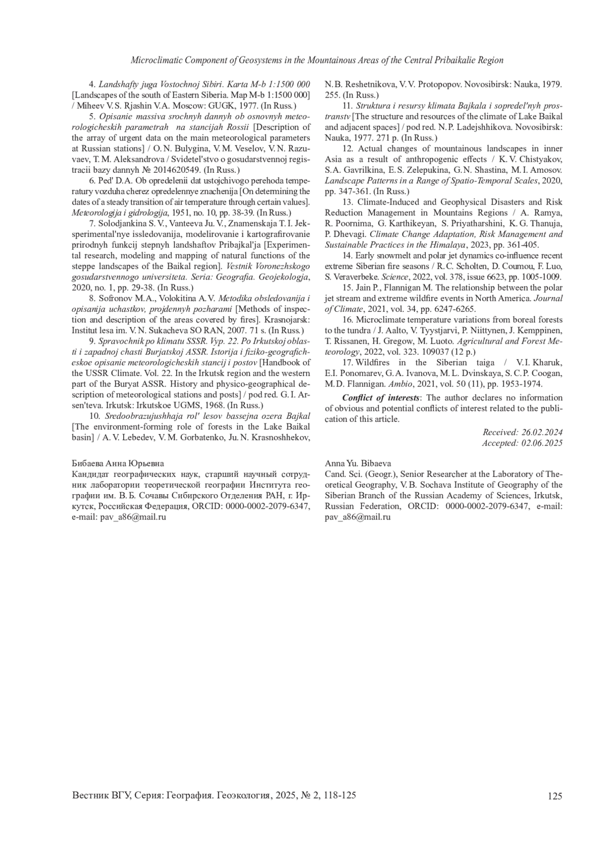 1. Бибаева А. Ю. Особенности возникновения и развития природных пожаров в Западном Прибайкалье // География и природные ресурсы, 2020, № 5, с. 85-91. EDN: TJXYWC