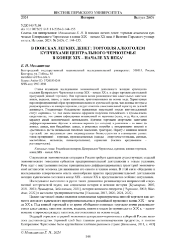 1. Абдрахманов К.А. Торговля алкоголем как сфера купеческого предпринимательства в Оренбургском крае во второй половине XIX - начале XX веков // Современные исследования социальных проблем. 2016. № 3-2 (27). С. 7-28.