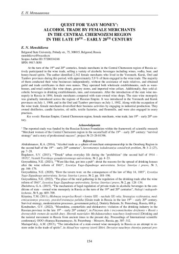 5. Горюшкина Н.Е. Место сельского схода в регулировании питейной торговли после винной реформы 1863 года // Изв. Юго-Запад. гос. ун-та. 2022. Т. 12, № 2. С. 124-134.