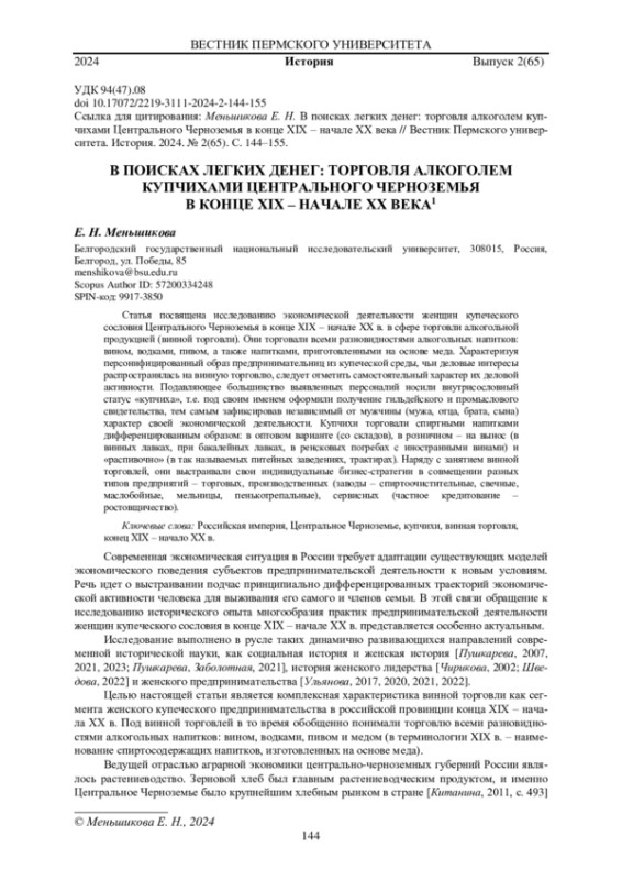 Современная экономическая ситуация в России требует адаптации существующих моделей экономического поведения субъектов предпринимательской деятельности к новым условиям. Речь идет о выстраивании подчас принципиально дифференцированных траекторий экономической активности человека для выживания его самого и членов семьи. В этой связи обращение к исследованию исторического опыта многообразия практик предпринимательской деятельности женщин купеческого сословия в конце XIX – начале XX в. представляется особенно актуальным.