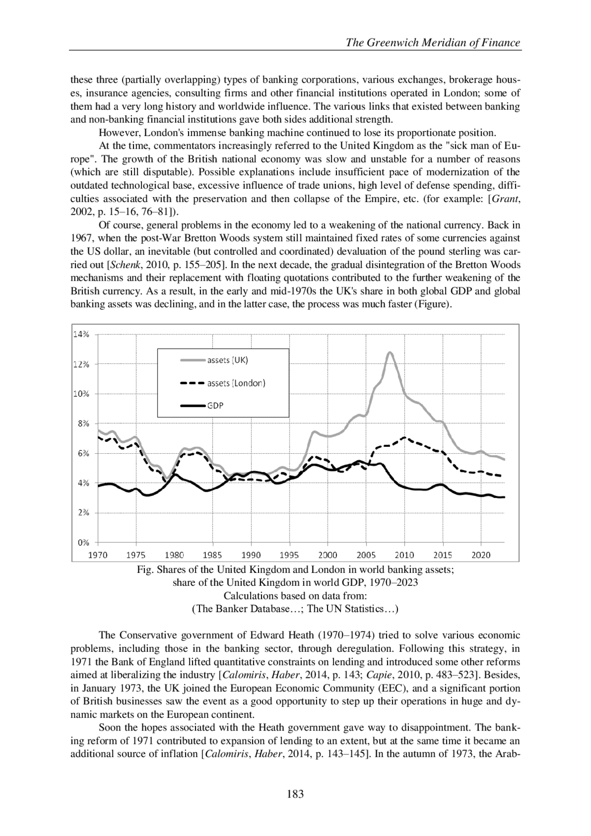 Статья посвящена развитию Лондона в качестве мирового и национального банковского центра на протяжении последних 50 лет - от начала 1970-х гг. до настоящего времени. В основу исследования положены большие массивы исторической статистики, систематизированные и обработанные автором. Лондон, являвшийся крупнейшим банковским центром мира в XIX - начале XX вв., в дальнейшем постепенно сдавал свои позиции; к 1970 г. он занимал только третье место в глобальной иерархии. Новые факторы, проявившиеся в 1970-е гг. (например, кризис Бреттон-Вудской валютной системы) способствовали дальнейшему отступлению Лондона. На следующем историческом этапе ситуация резко изменилась в результате дерегулирования национальной финансовой системы, проведенного консервативными правительствами М. Тэтчер и Дж. Мейджора (1979-1997), а также «новыми лейбористами» Т. Блэра (1997-2007). Пользуясь новым уровнем предпринимательской свободы, британские банки существенно расширили масштабы и направления своей деятельности. В 2008 г. Лондон занимал второе место в мире по активам банковских корпораций. Однако это достижение в значительной мере было связано с перепроизводством рискованных финансовых инструментов. Банковская система Великобритании пережила тяжелый спад во время Великой рецессии 2008-2009 гг. Вместе с тем основные проблемы были тогда сконцентрированы не в Лондоне, где банки оставались относительно стабильными, а в Эдинбурге. В дальнейшем лондонские корпорации возглавили процесс оздоровления национальной банковской системы. Лондон, давно утративший абсолютное лидерство, все же остается очень важным финансовым узлом и уверенно входит в число пяти - шести крупнейших банковских центров мира.