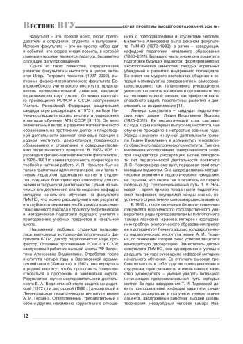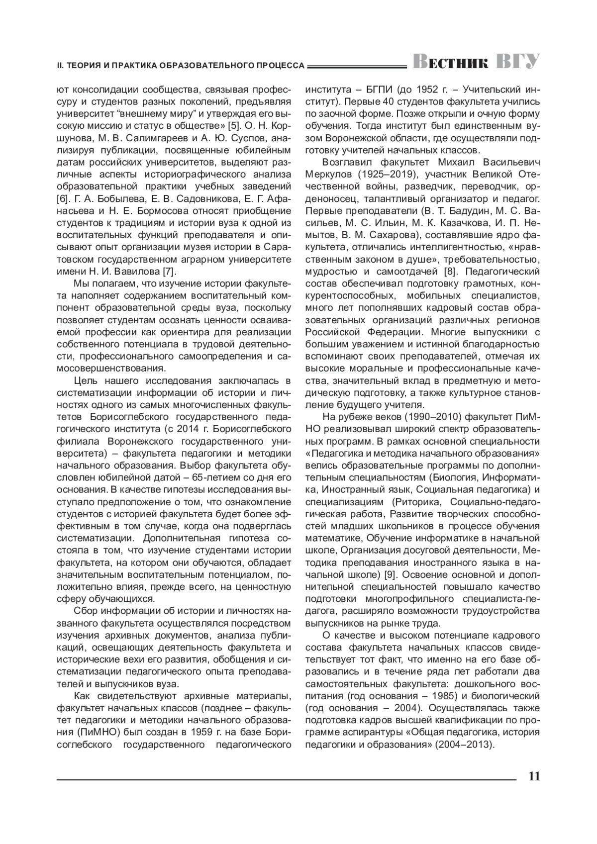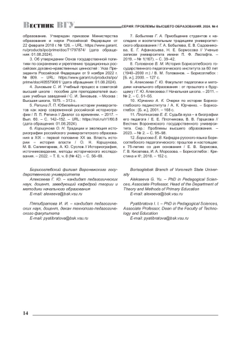 11. Плотникова Е. Е. Судьба вуза - в биографии его педагога / Е. Е. Плотникова, В. В. Горшкова // Вестник Воронежского государственного университета. Сер.: Проблемы высшего образования. -2023. - № 2. - С. 95-98.