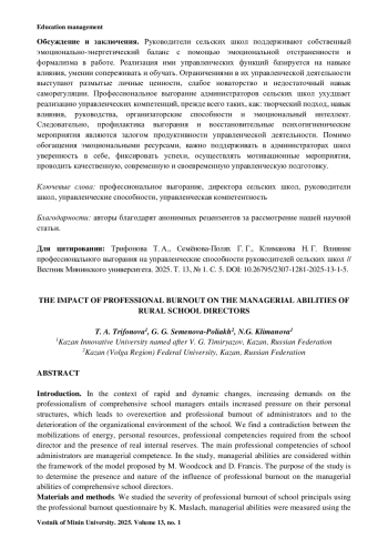 8. Виноградова Г. А., Адбрахимова Р. Ф. Взаимосвязь эмоционального выгорания и личностных особенностей руководителей образовательных учреждений // Доказательная педагогика и психология. 2019. № 1. C. 41-47. https://doi.org/10.18323/2221-5662-2019-1-41-47.