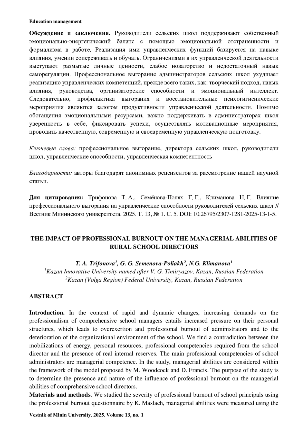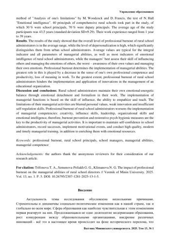 Материалы и методы. Выраженность профессионального выгорания руководителей школ изучалась с помощью опросника профессионального выгорания К. Маслач, управленческие способности измерялись при помощи методики «Анализ своих ограничений» М. Вудкока и Д. Фрэнсиса, теста Н. Холла «Эмоциональный интеллект». В исследовании участвовали 40 руководителей общеобразовательных сельских школ, из них 30 % – директора школ, 70 % – заместители директоров. Средний возраст участников исследования 43,5 года (стандартное отклонение SD=9,29). Стаж работы от 1 года до 39 лет. Результаты исследования. Результаты исследования показали, что общий уровень профессионального выгорания руководителей сельских школ находится в диапазоне средних значений, при этом высок уровень деперсонализации, что значимо отличает их от городских управленцев школ. Средние значения характерны для интегрального показателя и всех параметров управленческих способностей, а также большинства показателей эмоционального интеллекта администраторов сельских школ, при этом руководители наилучшим образом оценивают свой навык влияния на окружающих и управление эмоциями других, наихудшим – осознание собственных ценностей и управление собственными эмоциями. Профессиональное выгорание детерминирует реализацию управленческих способностей. Наибольшую роль в этом играет снижение чувства собственной профессиональной компетентности и продуктивности, потеря смысла в работе. В наибольшей степени профессиональное выгорание руководителей сельских школ препятствует внедрению и применению инноваций в управлении образовательной организацией.