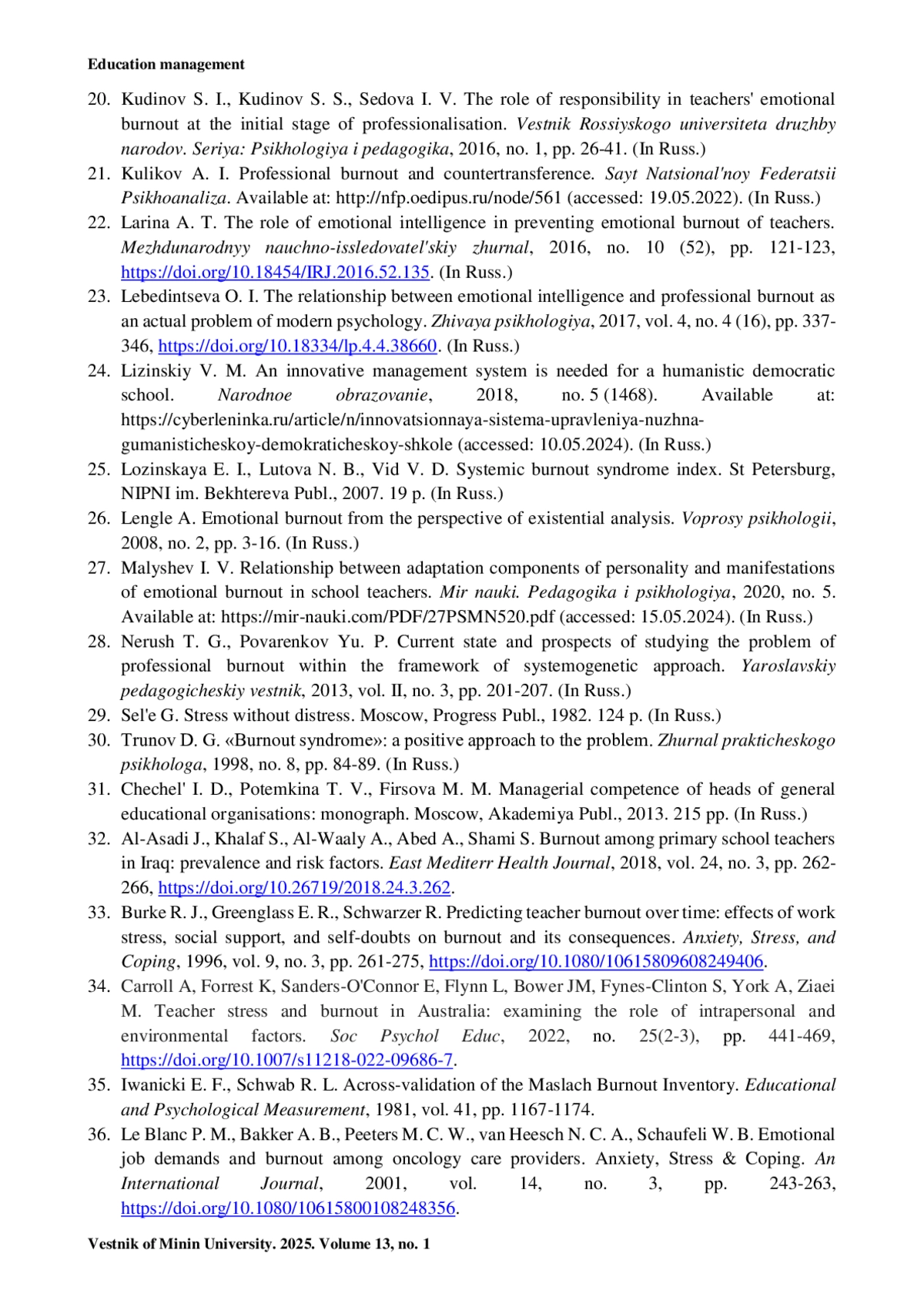 6. Белоусова С. С. Характеристики профессионального выгорания административно-управленческого персонала российских образовательных организаций в условиях внедрения инновационных технологий // Вестник РУДН. Серия: Психология и педагогика. 2021. № 1. С. 194-216. https://doi.org/10.22363/2313-1683-2021-18-1-194-216.