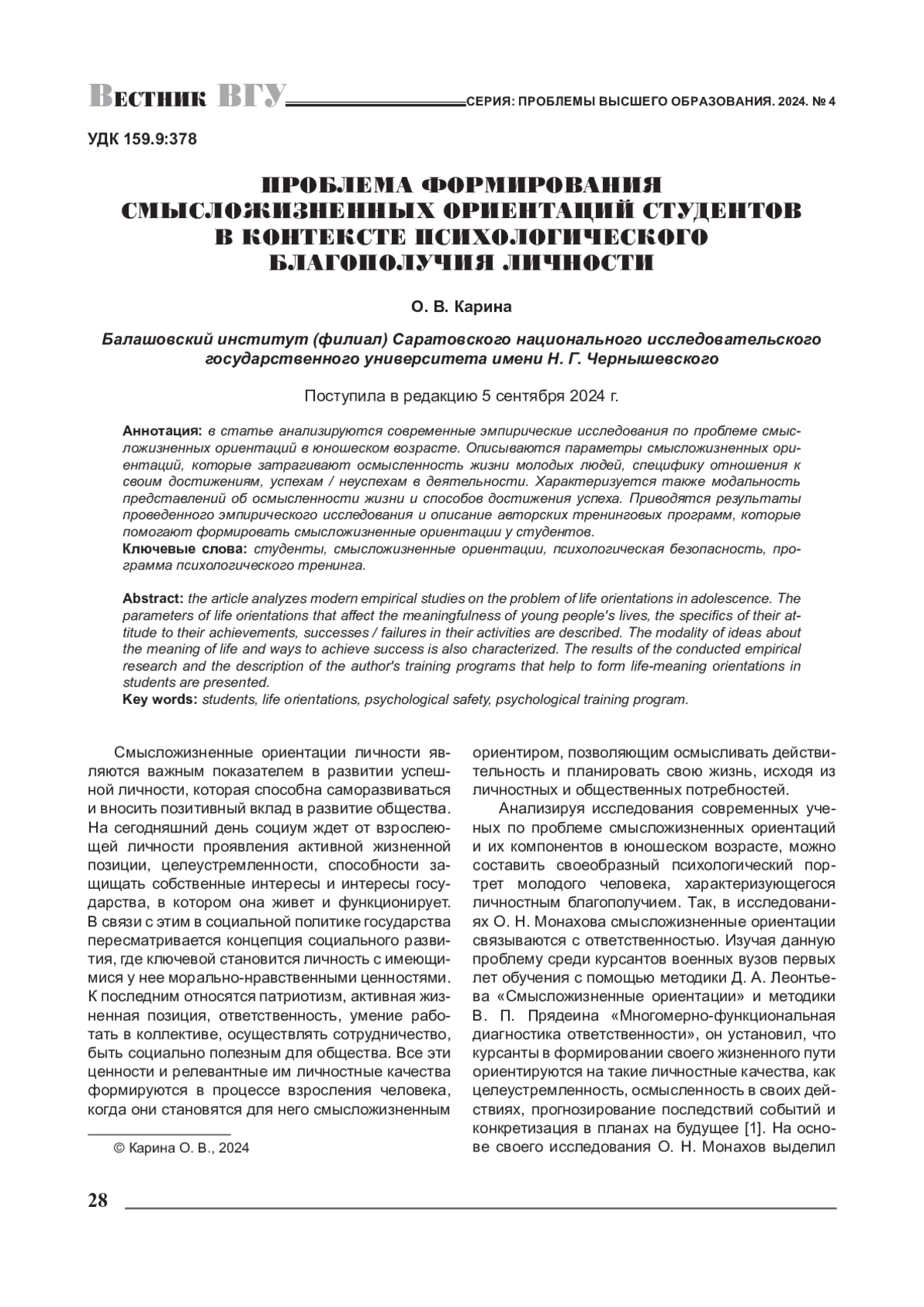1. Монахов О. Н. Смысложизненные ориентации курсантов младших курсов военного вуза в решении проблемы становления профессиональной компетентности / О. Н. Монахов // Вестник НЦБЖД. - 2020. - № 3(45). - С. 55-65. EDN: VUBCXC