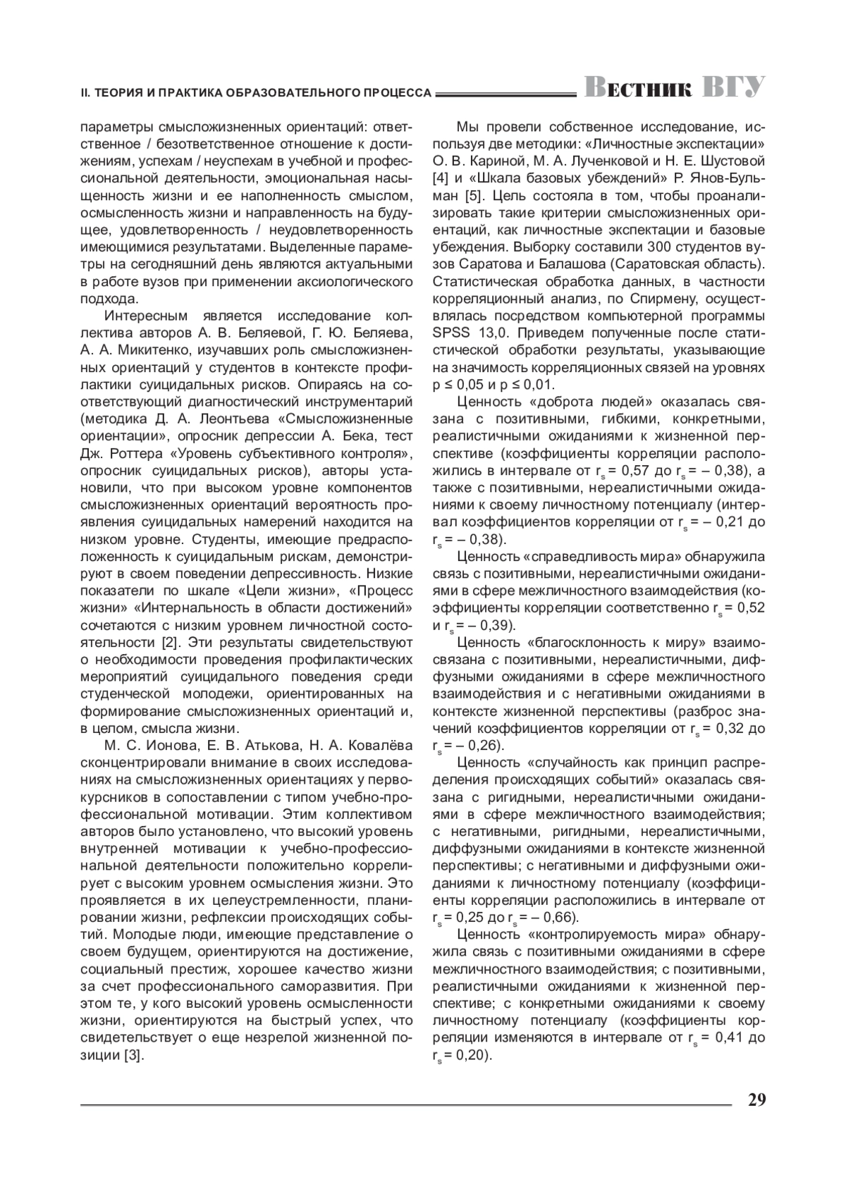 2. Беляева А. В. Формирование смысложизненных ориентаций на уровнях ценностей воспитания как профилактика суицидальных рисков у студентов / А. В. Беляева, Г. Ю. Беляев, А. А. Микитенко // Вопросы. Гипотезы. Ответы: наука XXI века: коллективная монография. - Краснодар: Априори, 2013. - С.46-69. EDN: RZYXWN