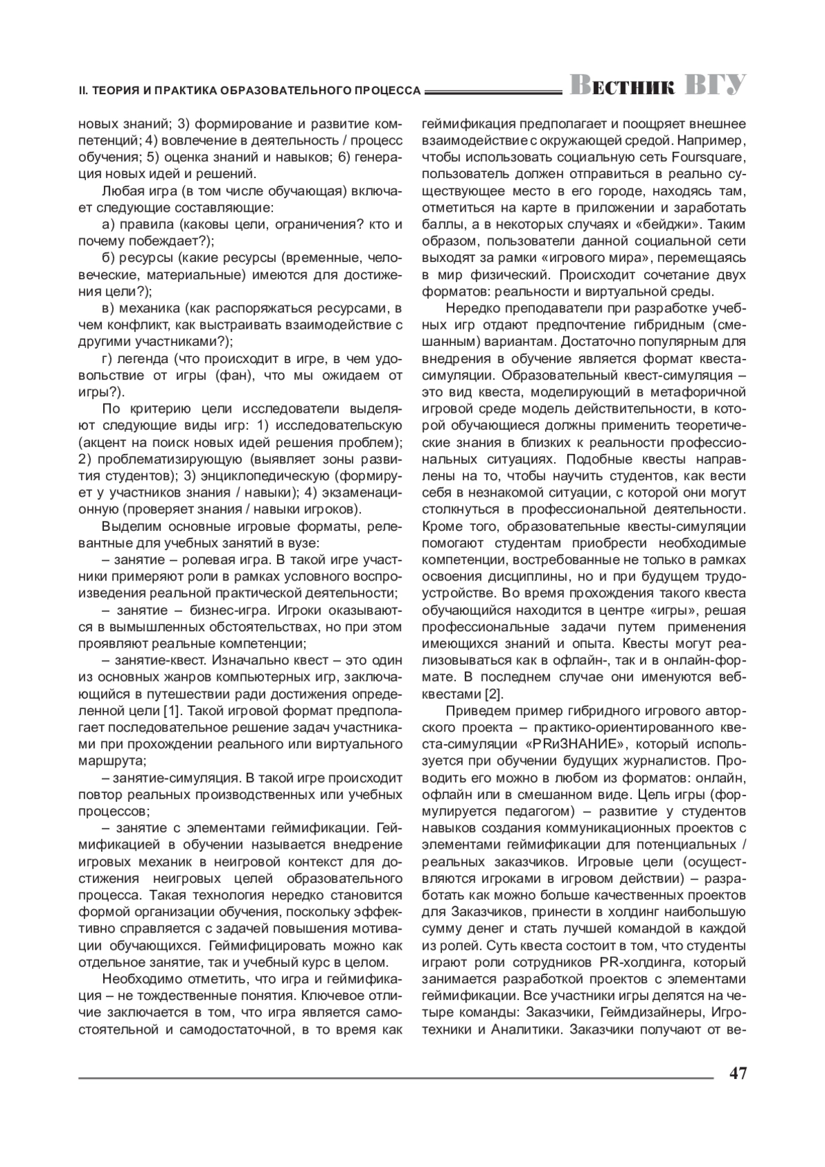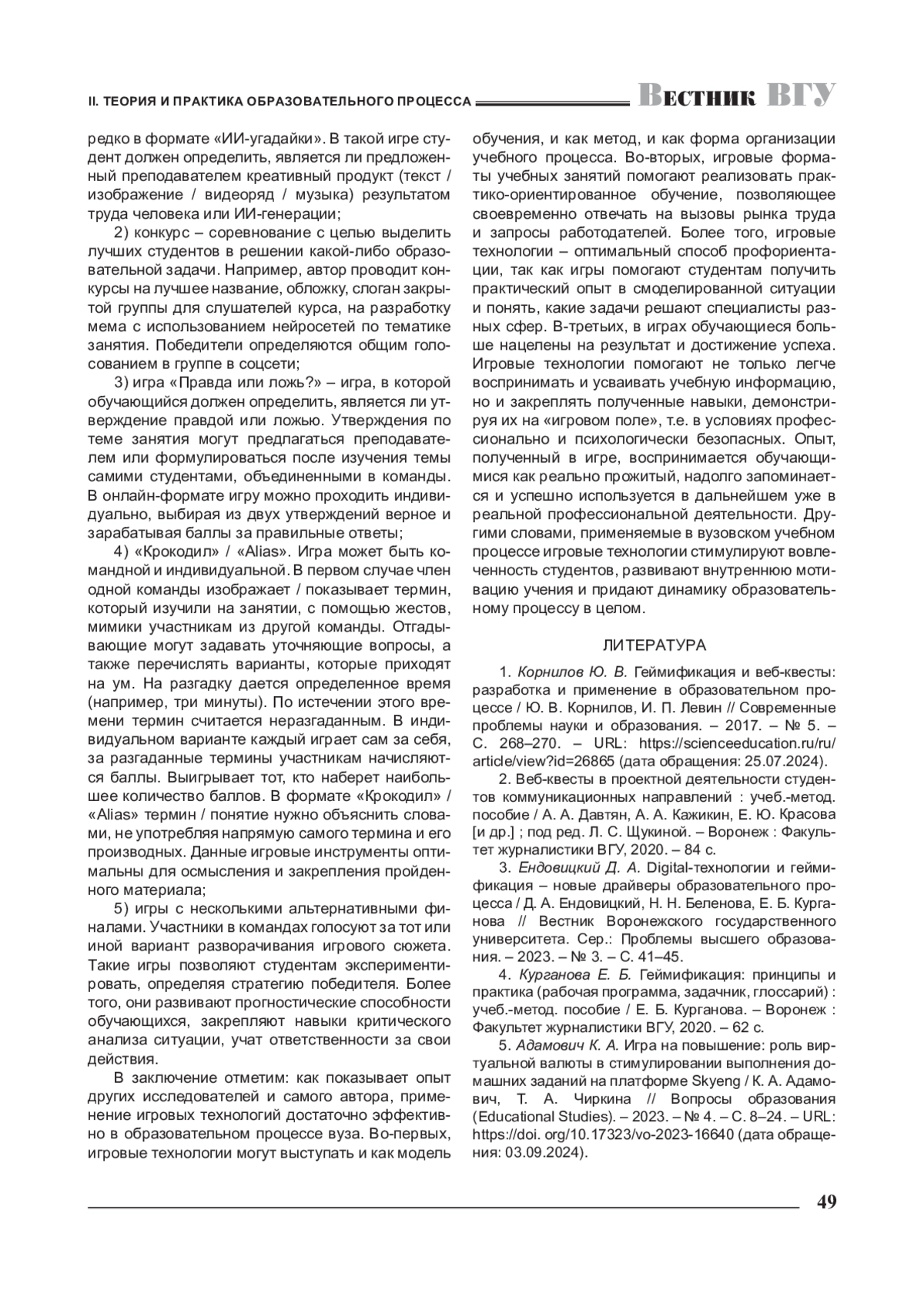 3. Ендовицкий Д. А. Digital-технологии и геймификация - новые драйверы образовательного процесса /Д. А. Ендовицкий, Н. Н. Беленова, Е. Б. Курганова // Вестник Воронежского государственного университета. Сер.: Проблемы высшего образования. - 2023. - № 3. - С. 41-45.