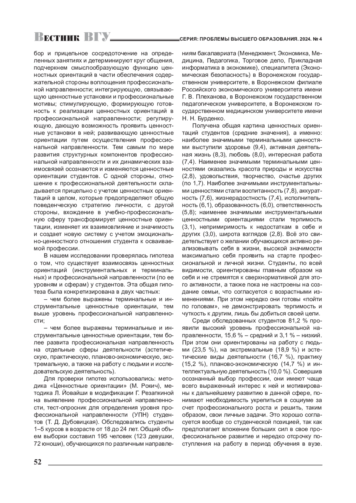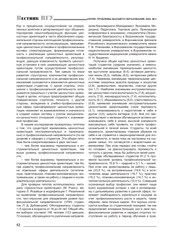 В статье рассматривается взаимосвязь ценностных ориентаций и профессиональной направленности у студентов как в целом, так и по разным сферам деятельности. В результате установлено, что терминальное ценностное наполнение имеет общие тенденции относительно связи с направленностью на эстетические и практические виды деятельности и отличается в остальных случаях, наиболее сильно при ориентации на работу с людьми и исследования. Проявляется более выраженное своеобразие ценностей-целей при направленности на работу с людьми, ценностей-средств при практической направленности, а всей системы ценностных ориентаций - при направленности на исследовательскую деятельность.